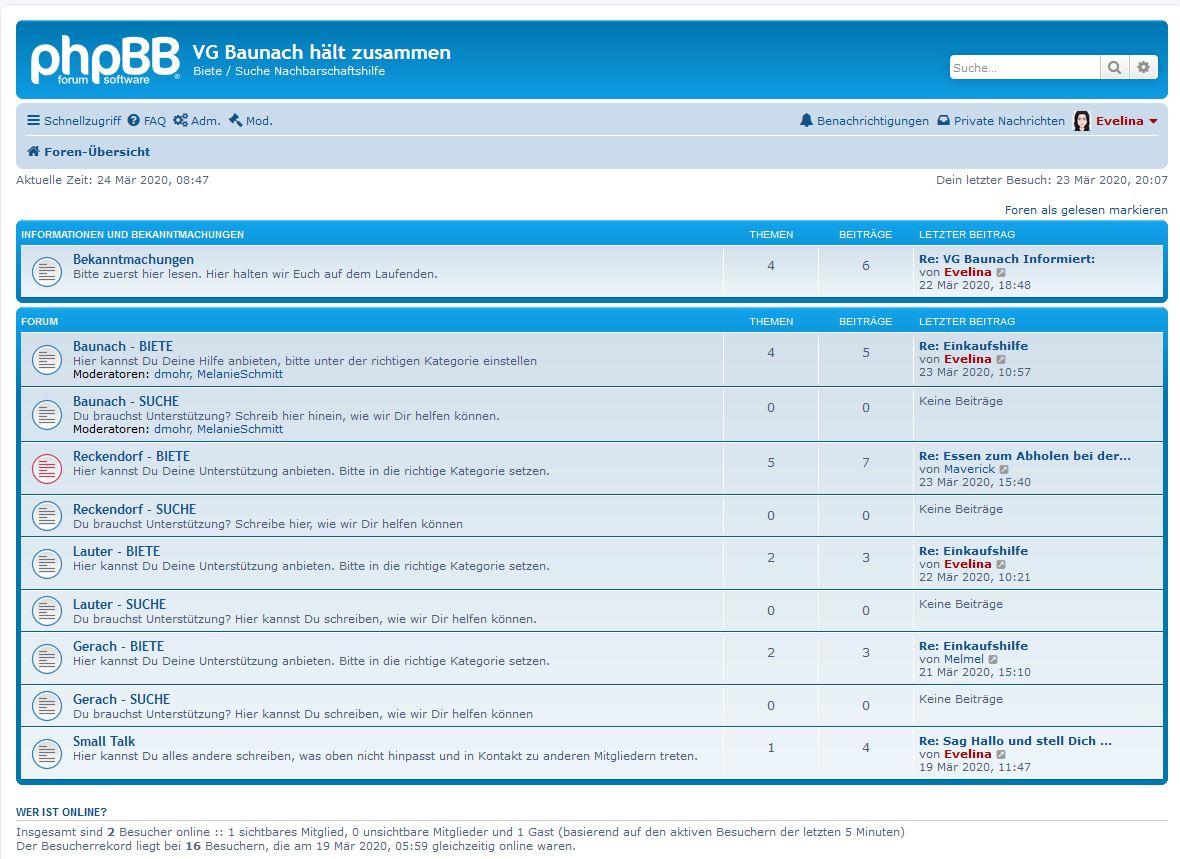 Das Forum ist für alle Gemeinden installiert worden und bietet die Möglichkeit, nach Themen sortiert Hilfe anzubieten und zu finden. Man kann seine Kontaktdaten hinterlegen oder aber auch über das Forum per Privater Nachricht angeschrieben werden. Gerne können sich auch Helfer melden, die Hilfsangebote und -gesuche in ihrer Gemeinde koordinieren.